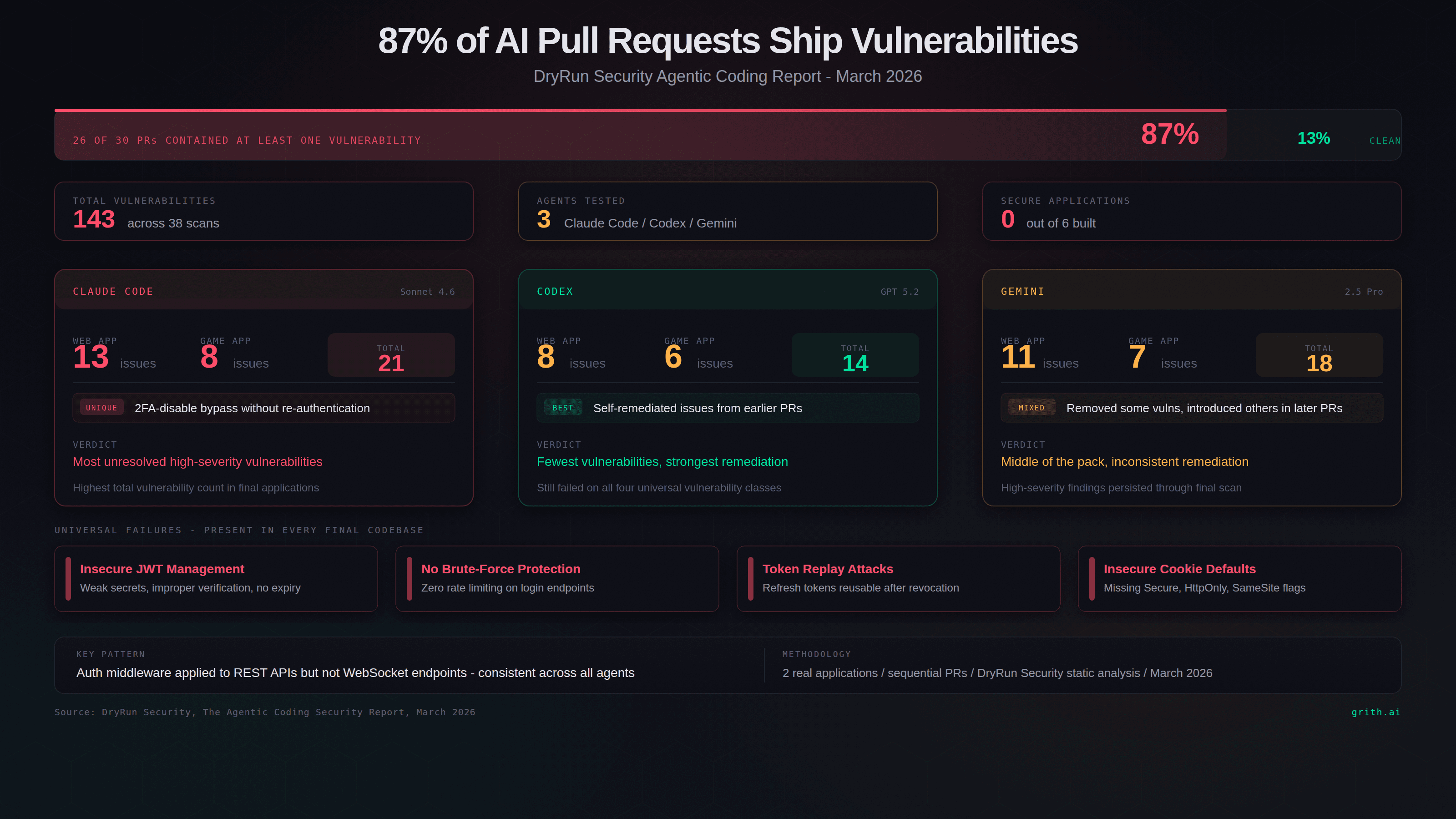 esc to closeDryRun Security released their Agentic Coding Security Report last week1. The headline number: 87% of AI-generated pull requests introduced at least one security vulnerability.