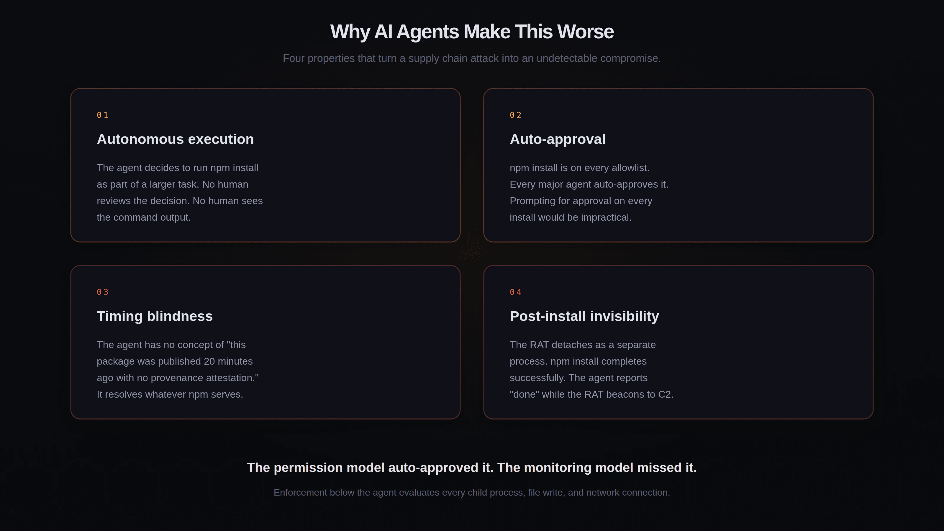 The pattern is consistent: the agent runs a command that looks routine, the command has side effects that are invisible to the agent, and the damage happens before anyone can intervene. The permission prompt model does not help because npm install is always approved. The monitoring model does not help because the RAT detaches before the command returns.