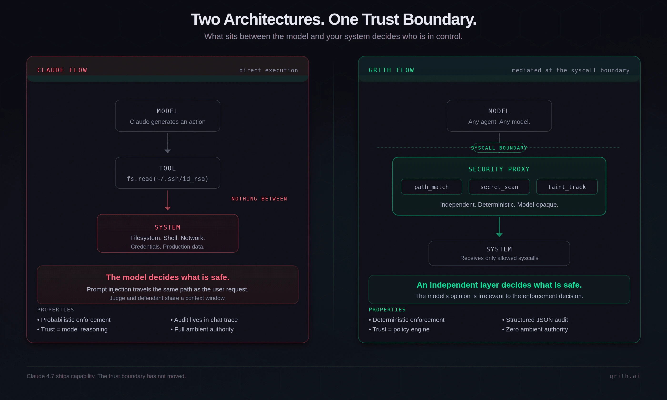grith starts with zero ambient authority. Every capability must be explicitly granted, per action, through a controlled interface3. The agent can only do what the policy allows, and the policy is enforced at the syscall boundary by code the model cannot influence.
