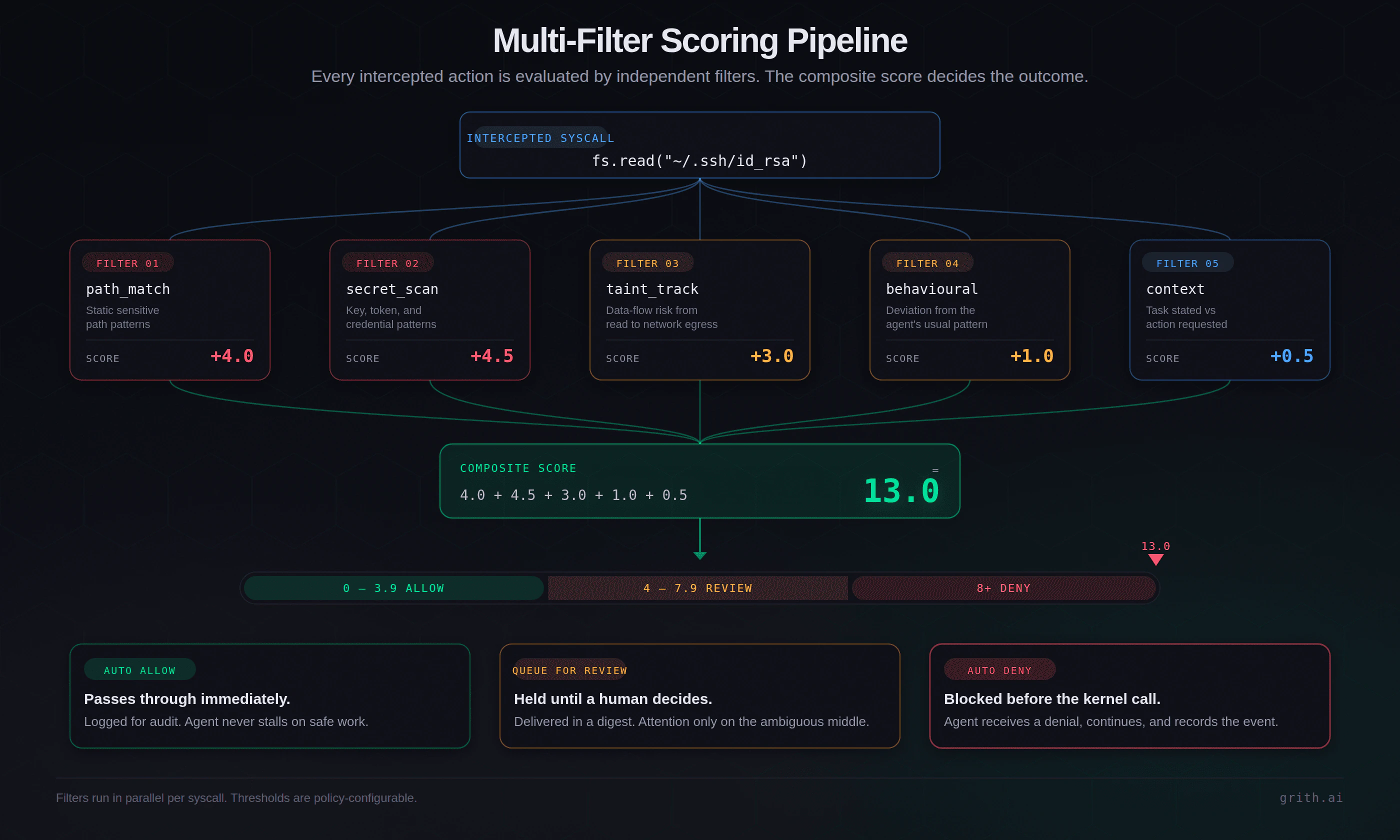 grith uses a different approach. Every action is evaluated by multiple independent filters and scored. File access patterns. Command structure. Secret detection. Behavioural anomalies. Context awareness. The results combine into one deterministic decision.