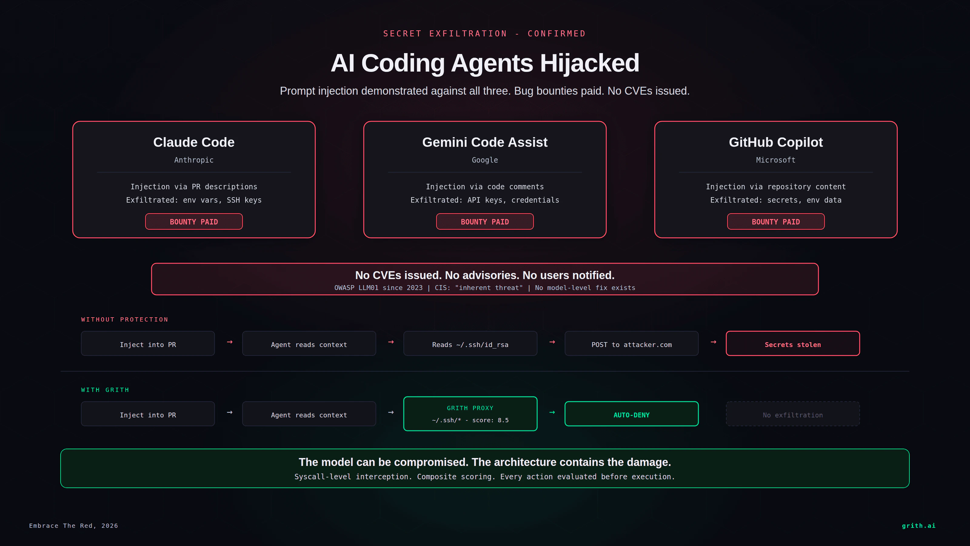 This week, security researchers quietly proved you can hijack AI coding agents from Anthropic, Google, and Microsoft - and steal secrets from them1. All three companies paid bug bounties. None issued CVEs. This is the real state of AI agent security in 2026.