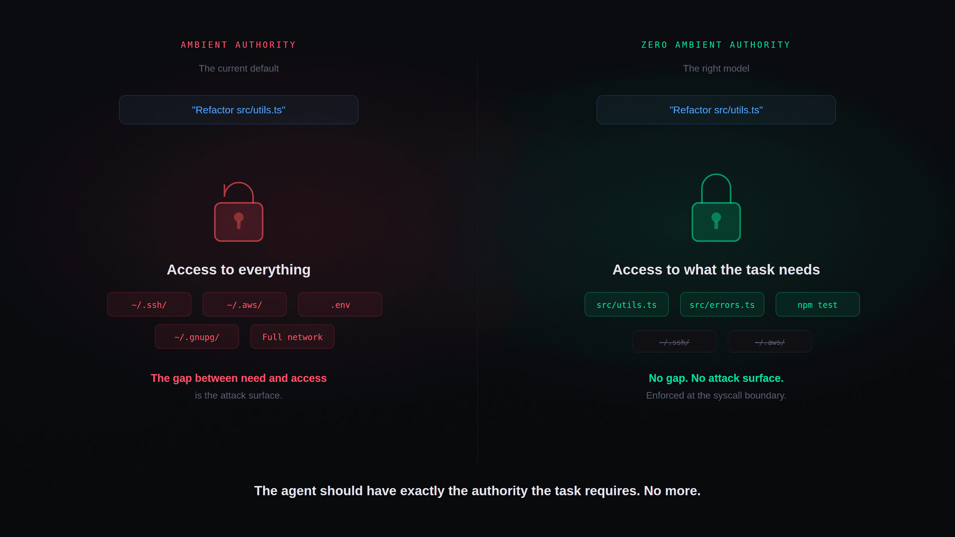 Zero ambient authority is not a feature. It is a principle. And it is the principle that should govern every AI agent that runs on your machine.