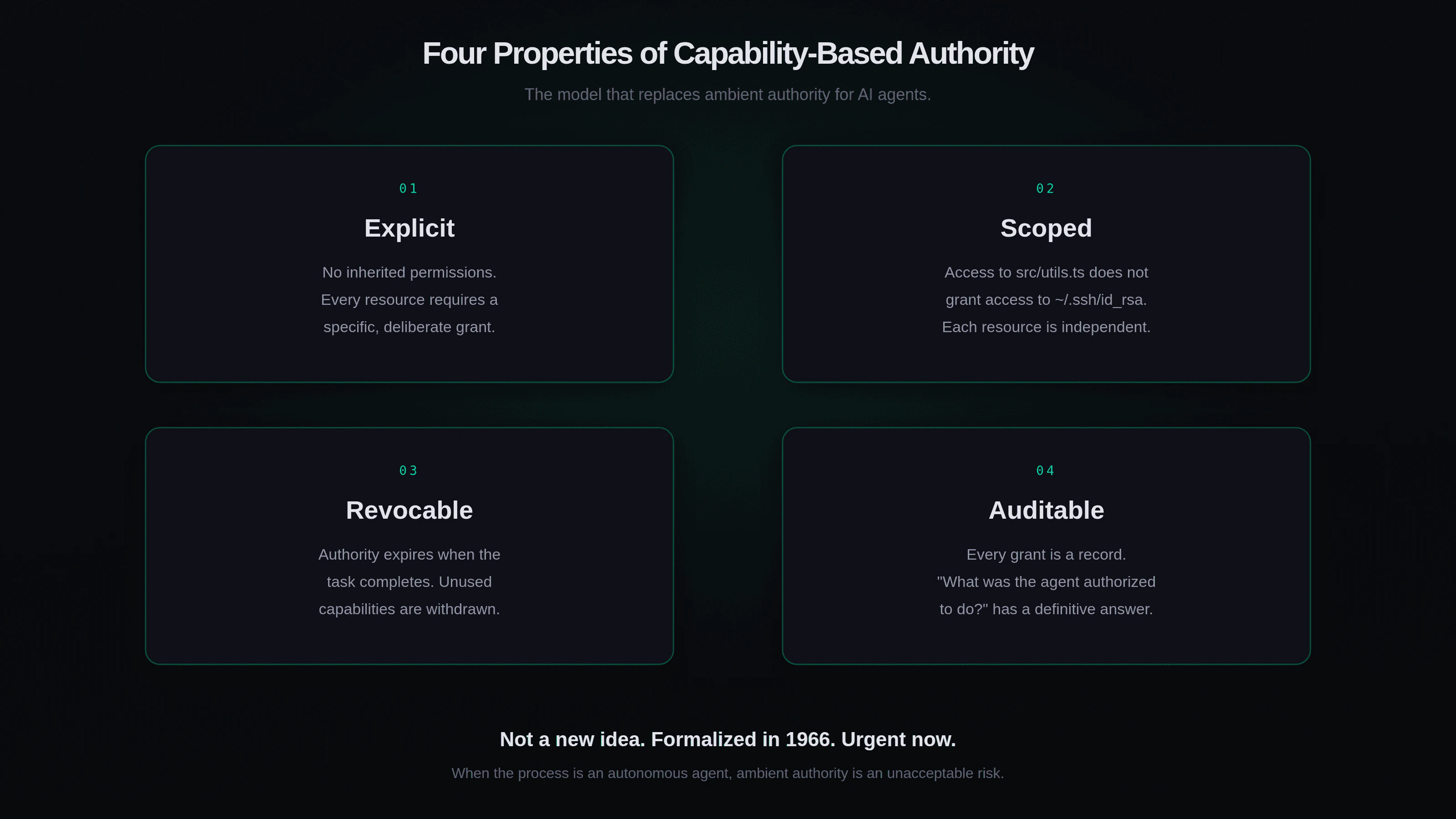 This is ambient authority. It is how Unix processes have worked for fifty years. And it is exactly the wrong security model for AI agents.